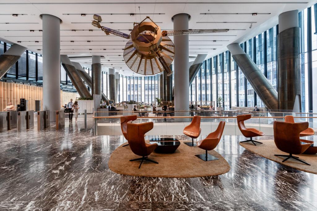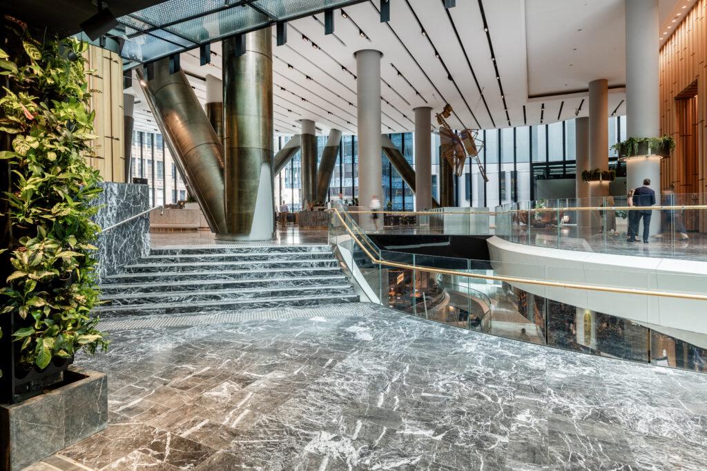The refurbishment successfully added two concierge desks, modern digital displays, an innovative Third Space, and café improvements, complemented by vibrant greenery. These updates blend seamlessly with the lobby’s original bronze-clad columns and marble flooring, maintaining its architectural integrity while adding contemporary flair.